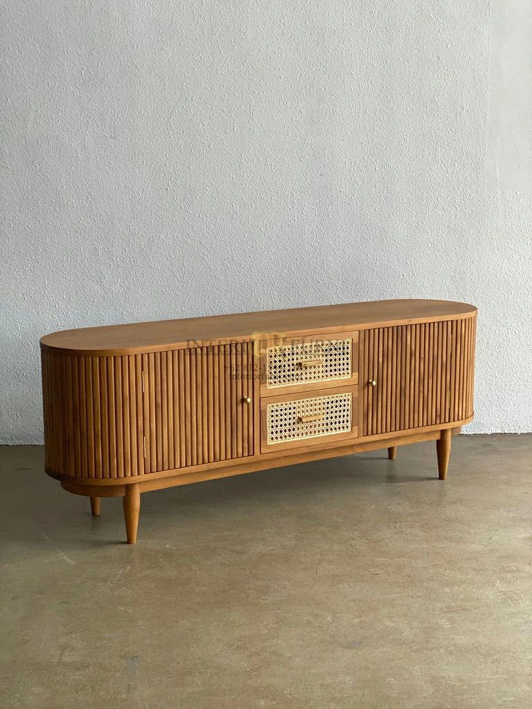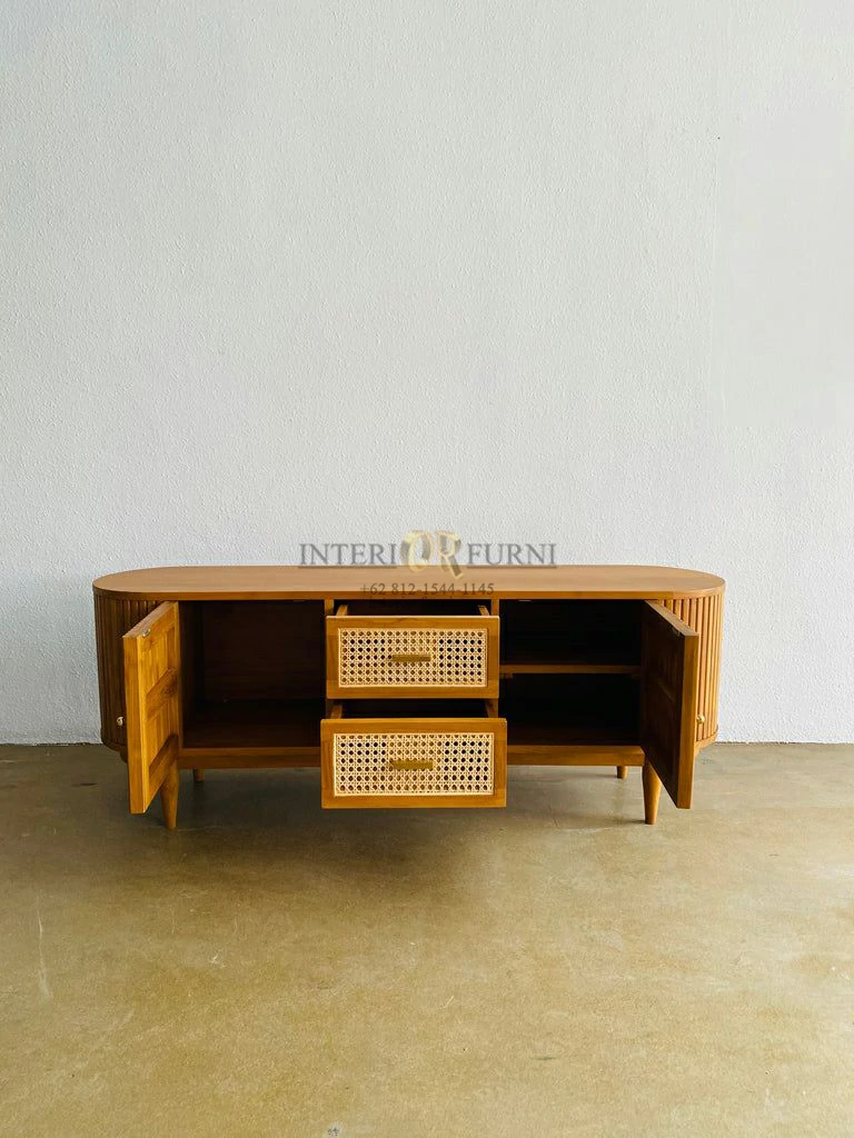 Dengan desain yang simpel dan unik, bufet TV ini memiliki nilai estetik tersendiri, kemudian dengan menggunakan bahan baku berupa full kayu solid membuat TV cabinet ini memiliki daya tarik tambahan dan tentunya memiliki kekuatan yang tidak diragukan lagi, dengan kata lain furniture memiliki kualitas yang sangat baik. Tentunya bufet TV ini dapat bertahan dalam waktu yang lama.