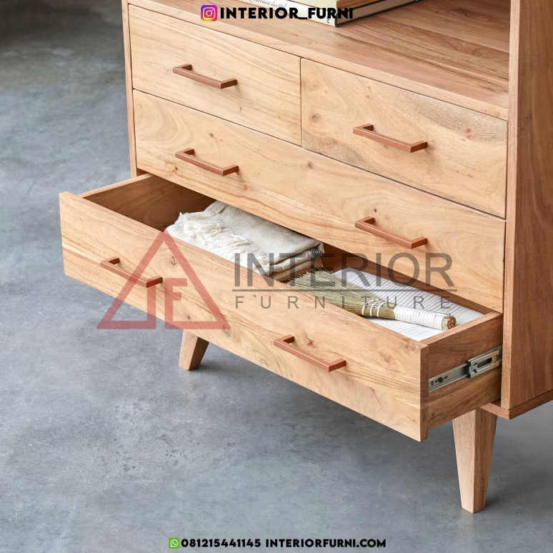 Dengan desain yang simpel dan unik, buffet minimalis ini memiliki nilai estetik tersendiri, kemudian dengan menggunakan bahan baku berupa full kayu solid membuat cabinet ini memiliki daya tarik tambahan dan tentunya memiliki kekuatan yang tidak diragukan lagi, dengan kata lain furniture memiliki kualitas yang sangat baik. Tentunya buffet minimalis ini dapat bertahan dalam waktu yang lama.