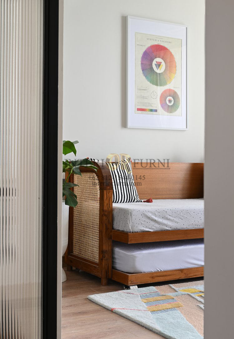 Dengan desain yang simpel dan unik, sofa bed ini memiliki nilai estetik tersendiri, kemudian dengan menggunakan bahan baku berupa full kayu solid membuat sofa ini memiliki daya tarik tambahan dan tentunya memiliki kekuatan yang tidak diragukan lagi, dengan kata lain furniture memiliki kualitas yang sangat baik. Tentunya sofa bed ini dapat bertahan dalam waktu yang lama.